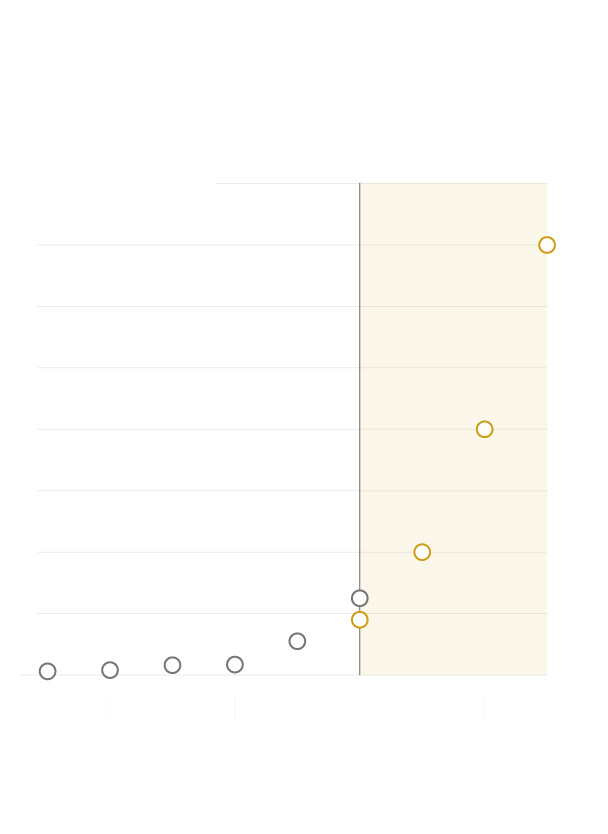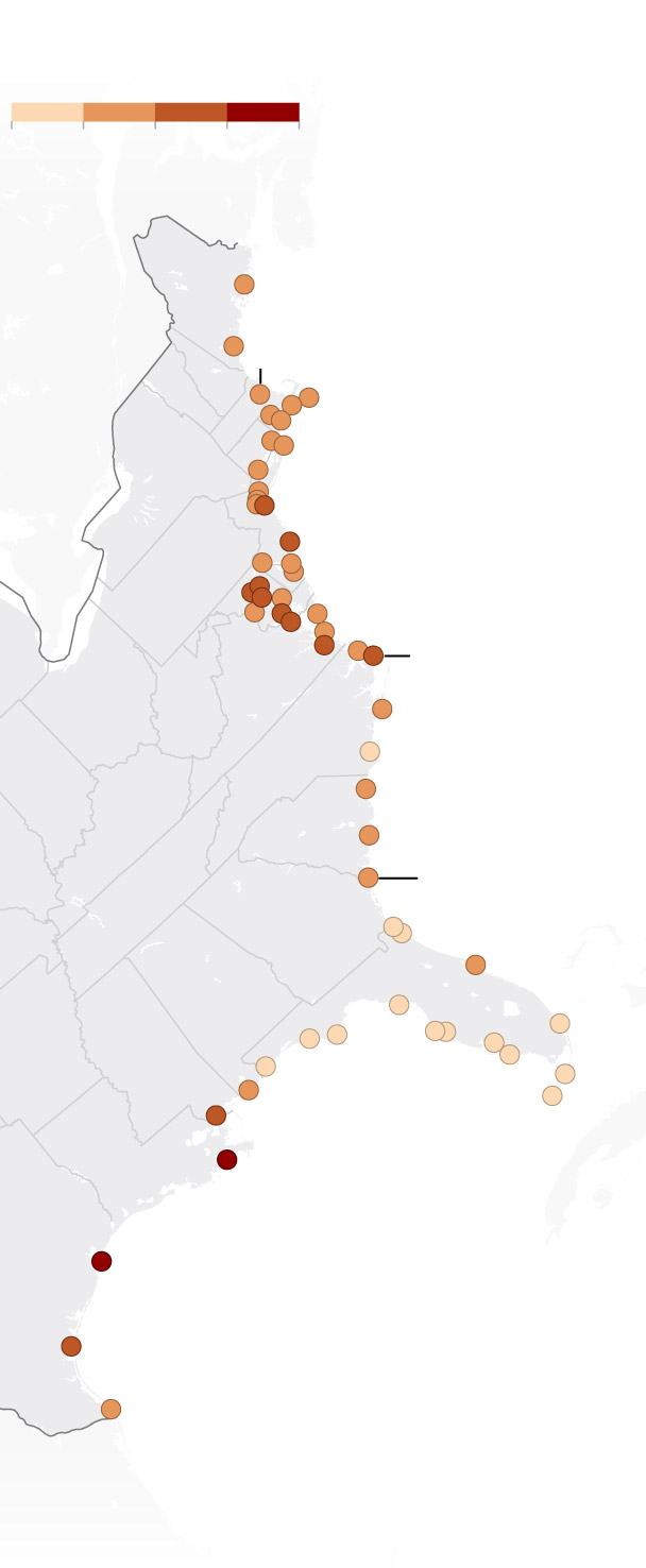 The Post used annual high-tide flood counts from NOAA for each available tide gauge and grouped the data by decade to track trends. NASA produced the projections for the numbers of high-tide flood days in each area from the 2020s to the 2050s. The Post used the intermediate sea level rise scenario for the high-tide flood projections.